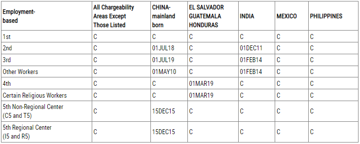 根據職業移民排期表B,EB-1、EB-4類別繼續無排期,EB-2、EB-3、EB-5類別沒有前進,原地踏步。