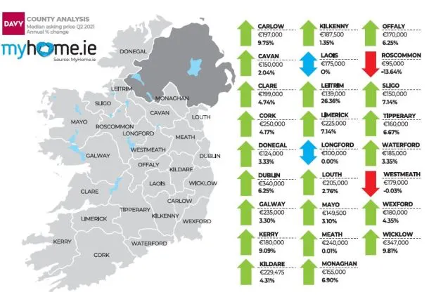 以下為2021年第二季度愛爾蘭各地區(qū)平均房價(jià)及上漲幅度。