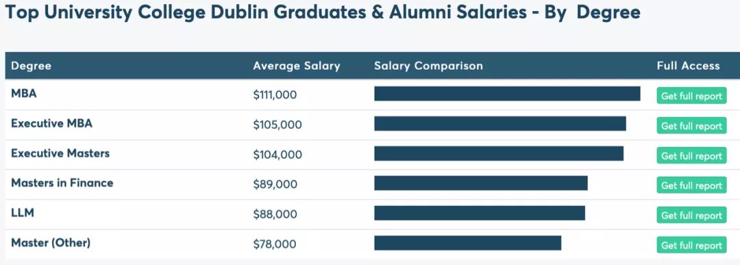 圖為UCD研究生畢業(yè)后最能“賺錢”的幾個(gè)行業(yè),其中MBA課程(工商管理碩士)的平均工資能夠達(dá)到11.1萬美元(約71萬人民幣/年)。