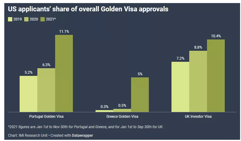 疫情后,美國人投資移民海外的興趣大幅提升,申請歐洲黃金簽證的美國人數量持續增長。