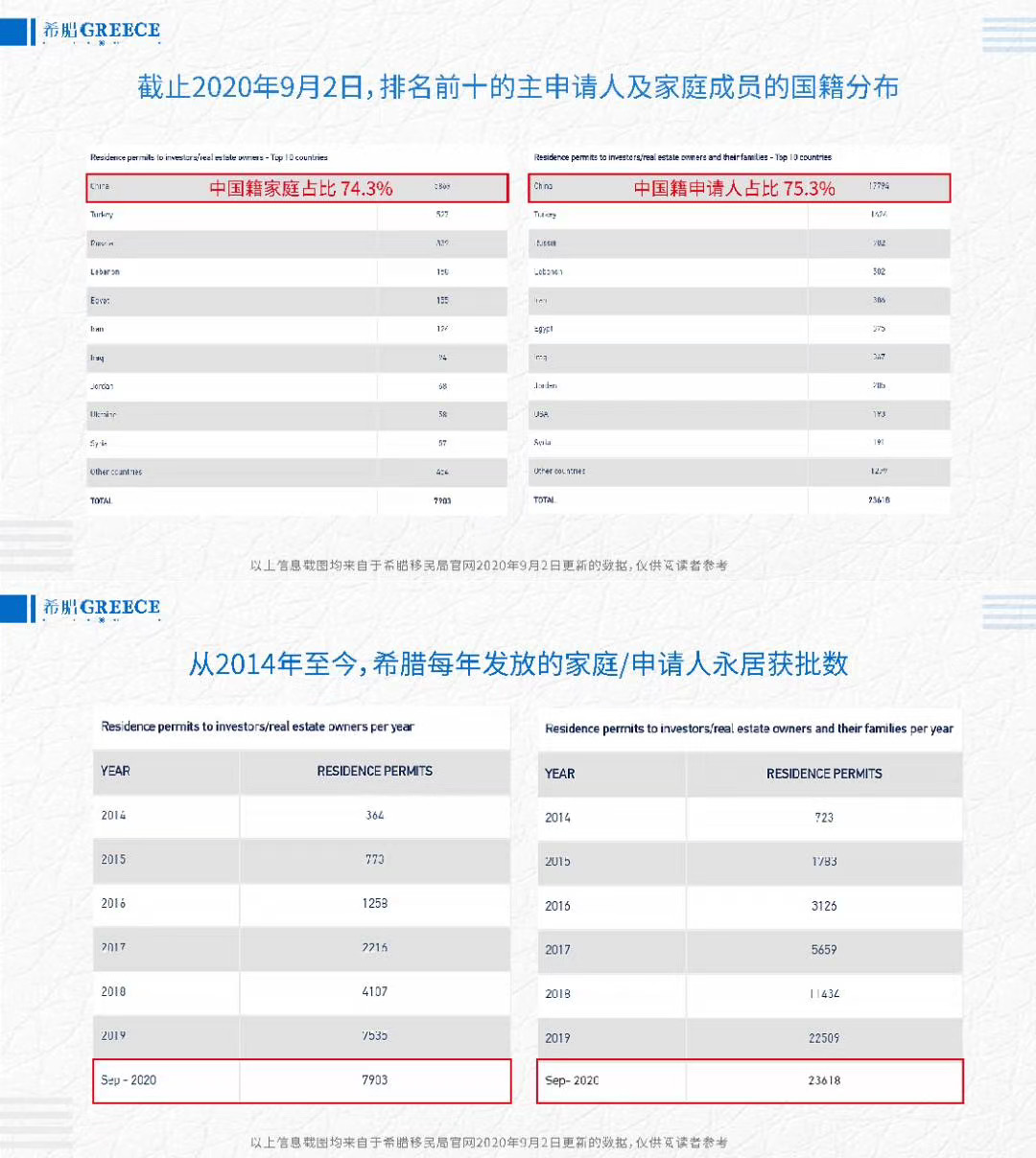 根據(jù)希臘移民局發(fā)布的最新黃金簽證數(shù)據(jù):截至2020年9月2日,希臘政府一共為主申請人簽發(fā)永久居留許可7903份,累計向31521位申請人(投資者及其附屬家庭成員)發(fā)放永居許可。