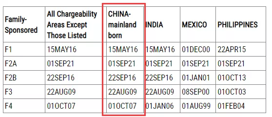 ·親屬移民排期表B,F(xiàn)2A類別前進了92天至2021年9月1日,其他類別無變化。