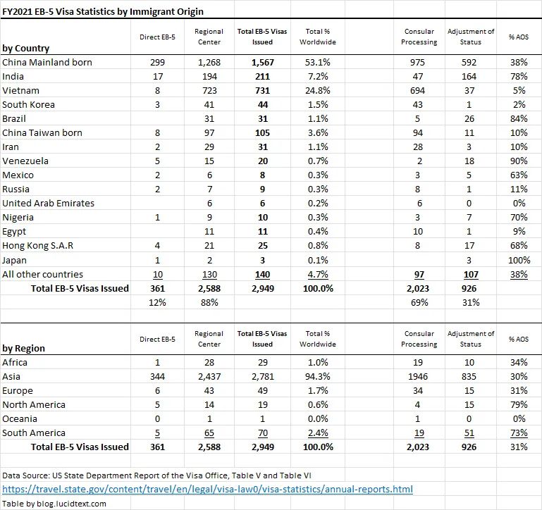 近日,美國國務院發布了2021財年的EB-5簽證發放報告,主要數據如下: