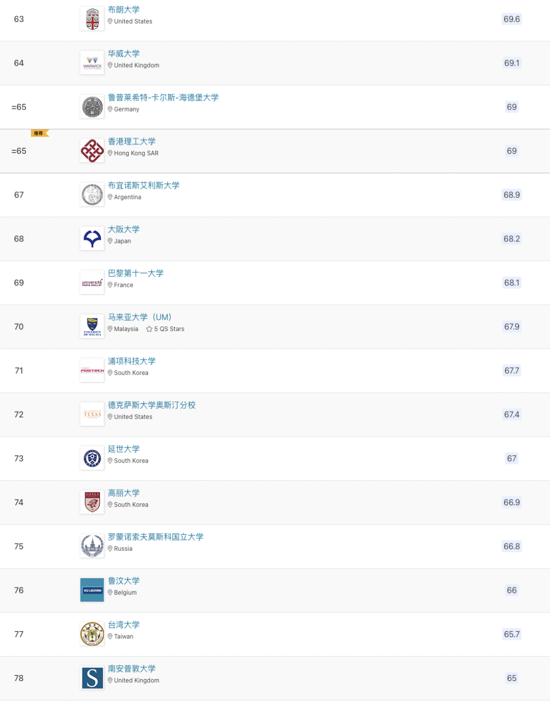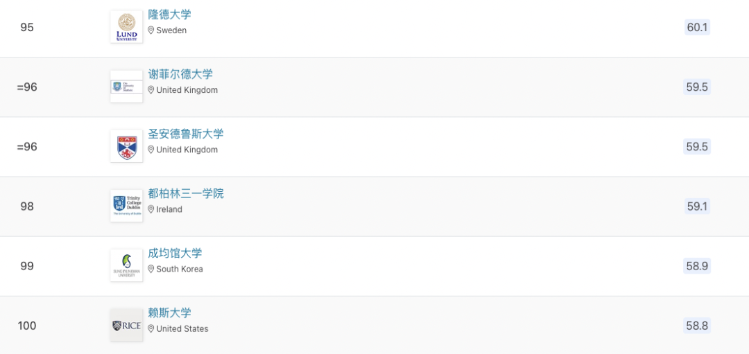 以下為世界前100所大學排名: