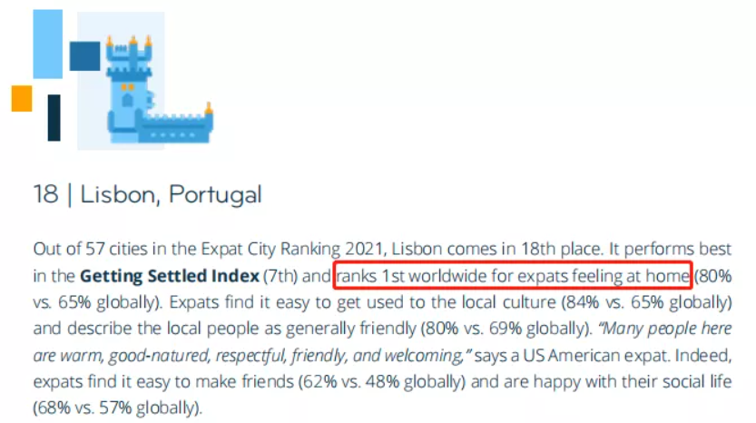 近日,外籍人士社區平臺InterNations公布2021年最新調查結果:葡萄牙首都里斯本被評為移居海外的外籍人士心目中最像家的城市。同時,在全球最宜移居城市中位列第18名。