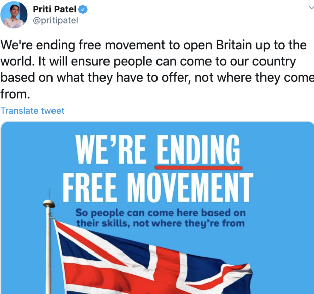 對(duì)此,英國內(nèi)政大臣帕特爾表示:“全新的移民法案將徹底終結(jié)歐盟人口自由流動(dòng)原則,并為我們推行新的積分制移民鋪平道路”。